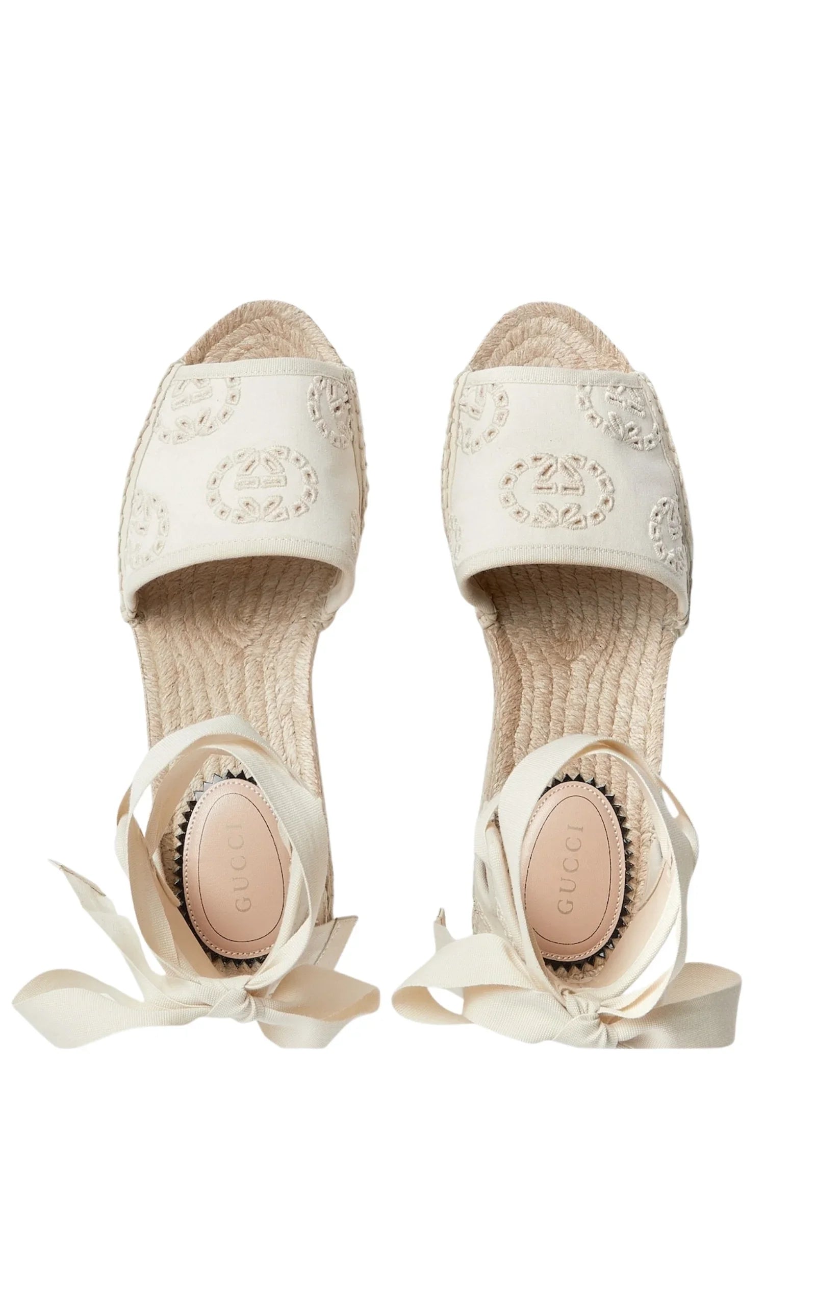 Embellished with the emblematic Interlocking G motif, these espadrilles are finished with a tonal ribbon ankle tie, adding a feminine and polished touch. A mid-heel platform ensures comfort and a subtle lift, making them perfect for both resort looks and city strolls.