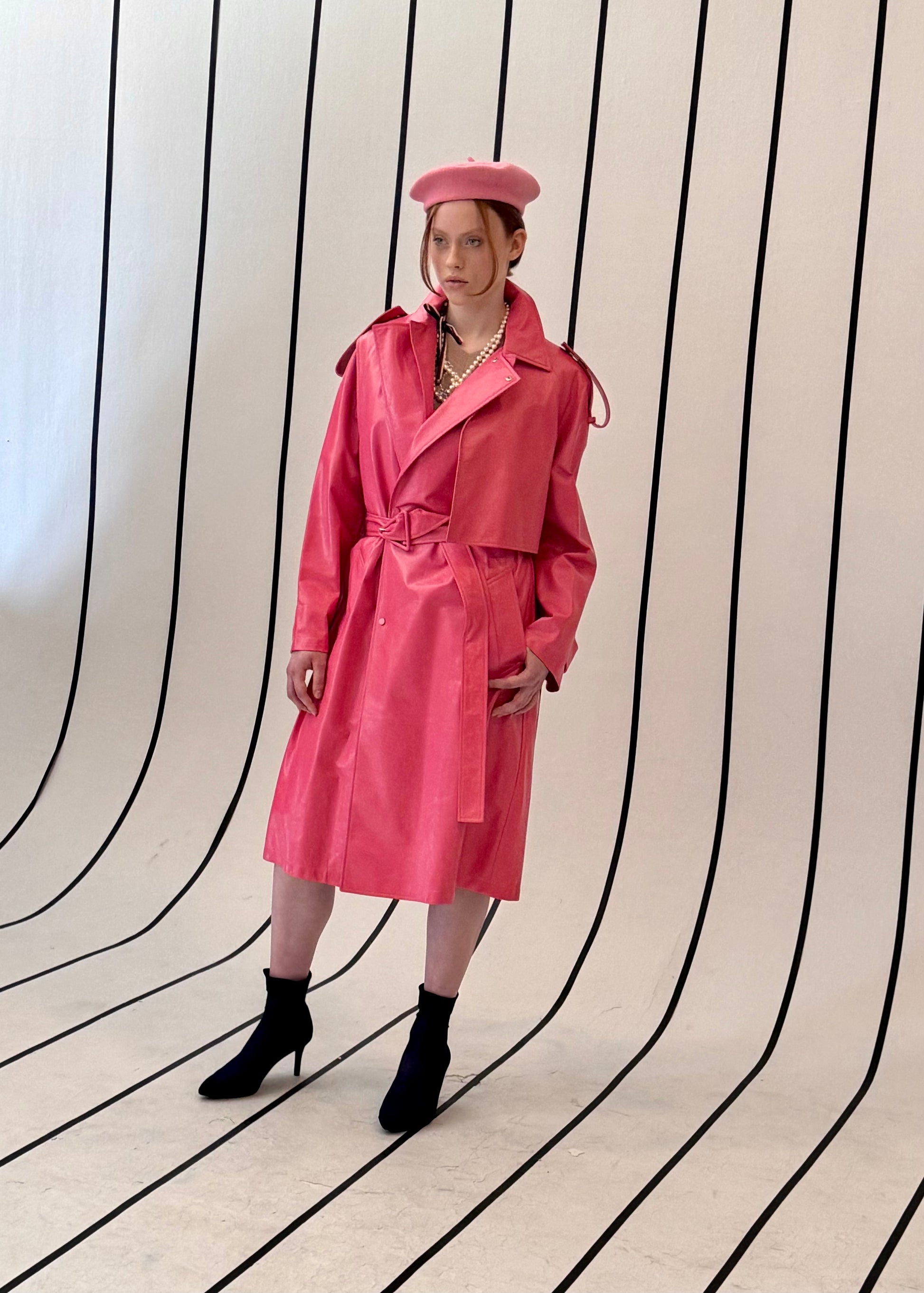 This trench coat is cut from crinkled glossed-leather in a vibrant 'Candy' pink hue and traced with strategically placed snaps - they'll allow you to transform it into a cropped jacket or sleeveless vest, depending on your mood. The triangular buckle is a subtle reference to the 'V' in the brand's name.-pink crinkled glossed-leather