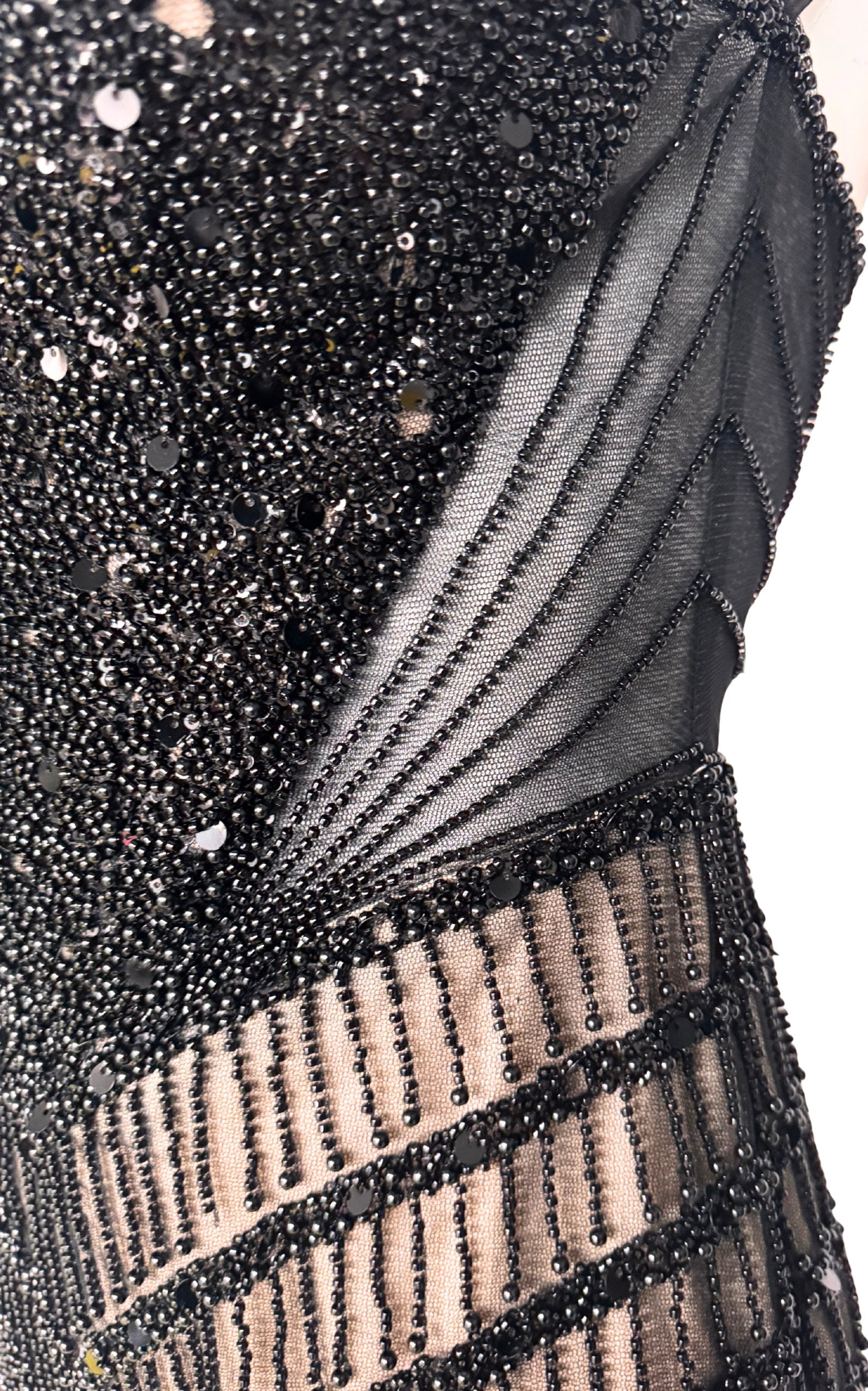This formal dress with V plunge neckline is adorned with dazzling sequins and beads, creating a luxurious and glamorous look. It has a fitted mermaid silhouette with corset detailing that enhances the body shape and an open back with a zipper. This gown has a fitted mermaid leg split adding a touch of glamour to the design. Crafted from semi-stretch satin, the dress offers a structured bodice for enhanced support, while the fit-and-flare silhouette and leg slit create an alluring, elegant look. Perfect for proms, galas, or black-tie events.