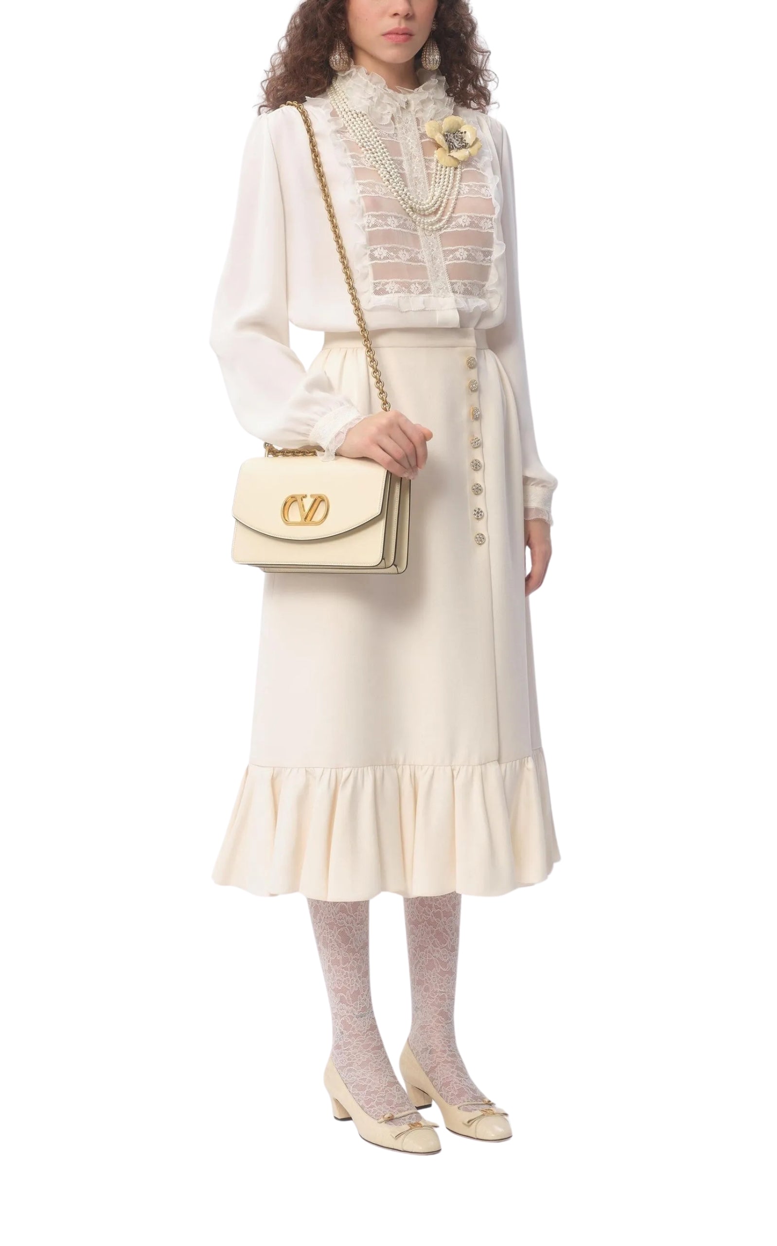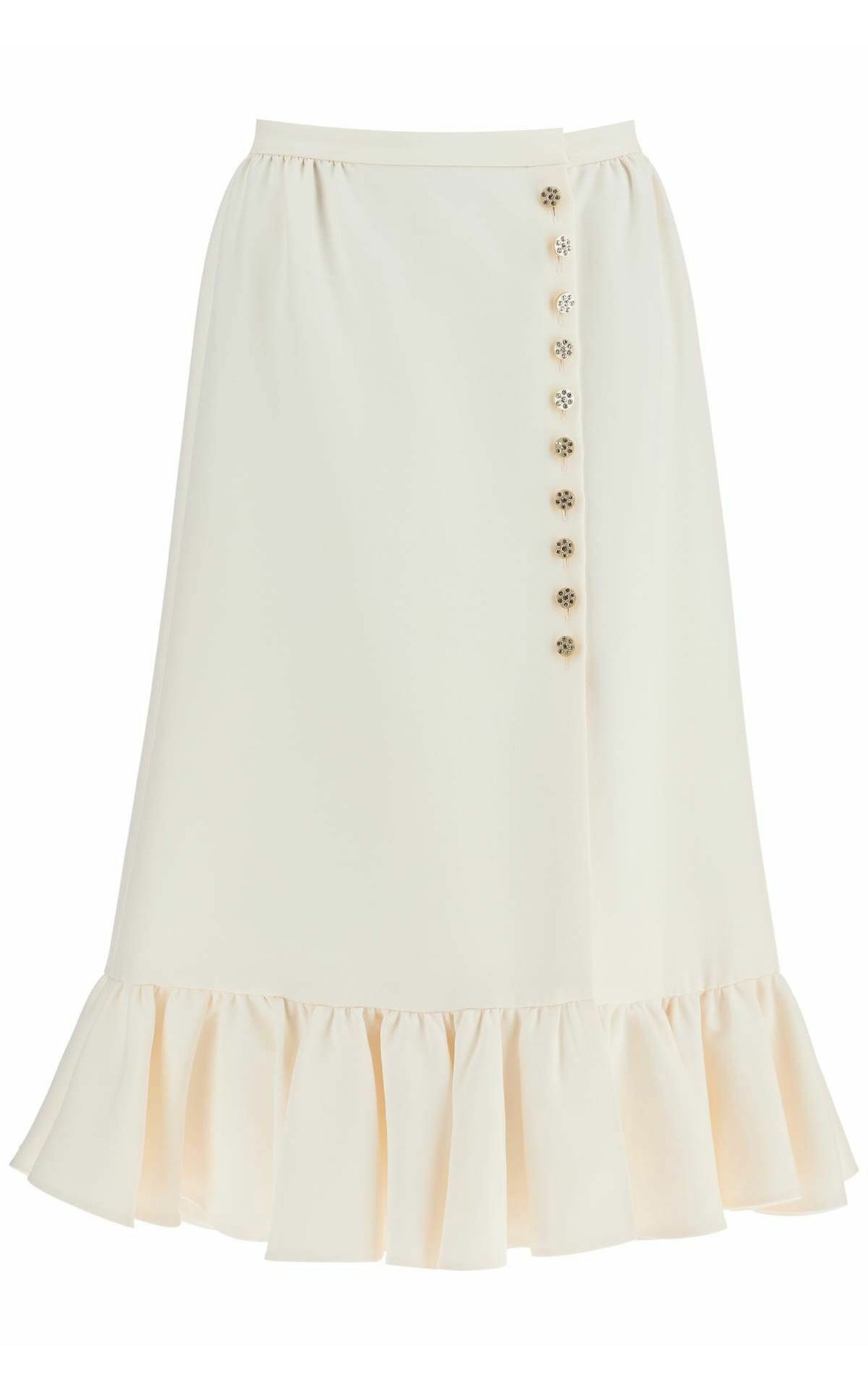 This Valentino Crepe Couture Midi Skirt is made from a luxurious virgin wool-silk blend in a refined ivory hue. The high-waisted silhouette is elevated with crystal-embellished buttons and a soft ruffle hem, while its silk lining ensures a smooth, comfortable fit. Perfect for sophisticated occasions and day-to-night styling.
