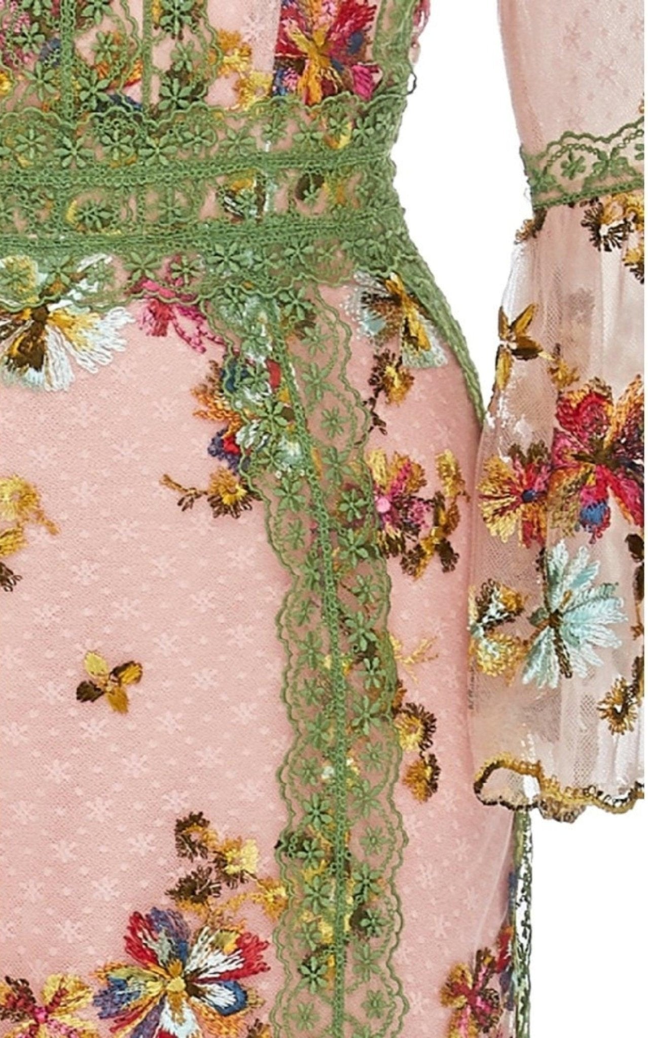 فستان كوستاريلوس متوسط الطول مصنوع من طبقات من التول الوردي الفاتح، ومطرز بنقوش زهرية معقدة مع ياقة وهمية وأكمام ثلاثة أرباع الطول - مما يمنحه إحساسًا ملكيًا فيكتوريًا.