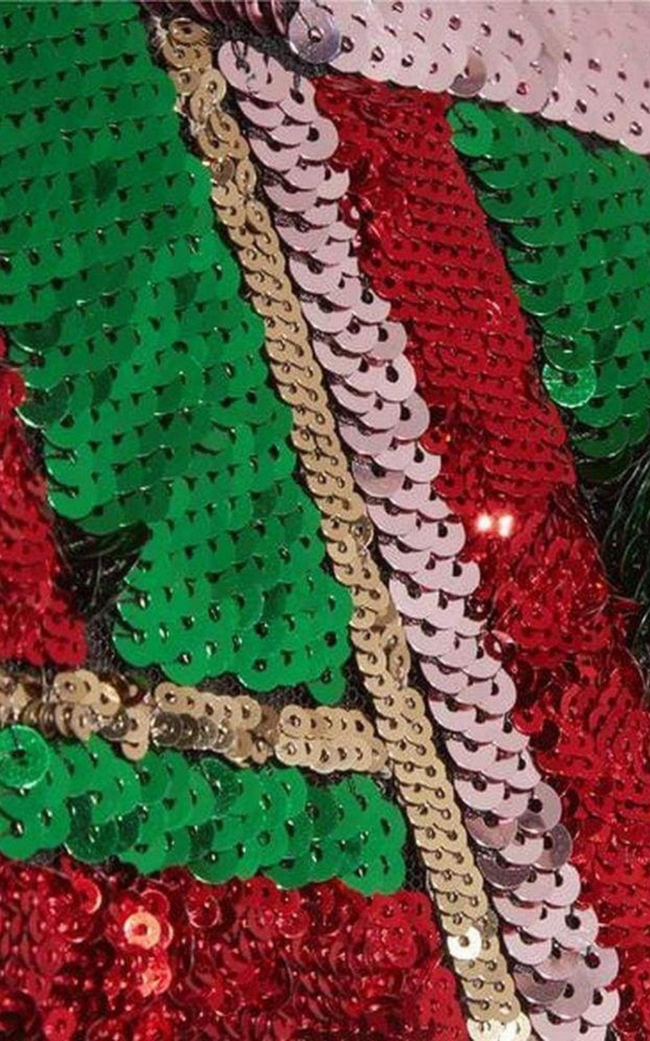 هذه التنورة المصنوعة من التول - وهي من القطع المفضلة لدينا من عروض الأزياء - مزينة بعشرات من الترتر الأحمر والأخضر والوردي والذهبي على شكل متعرج.