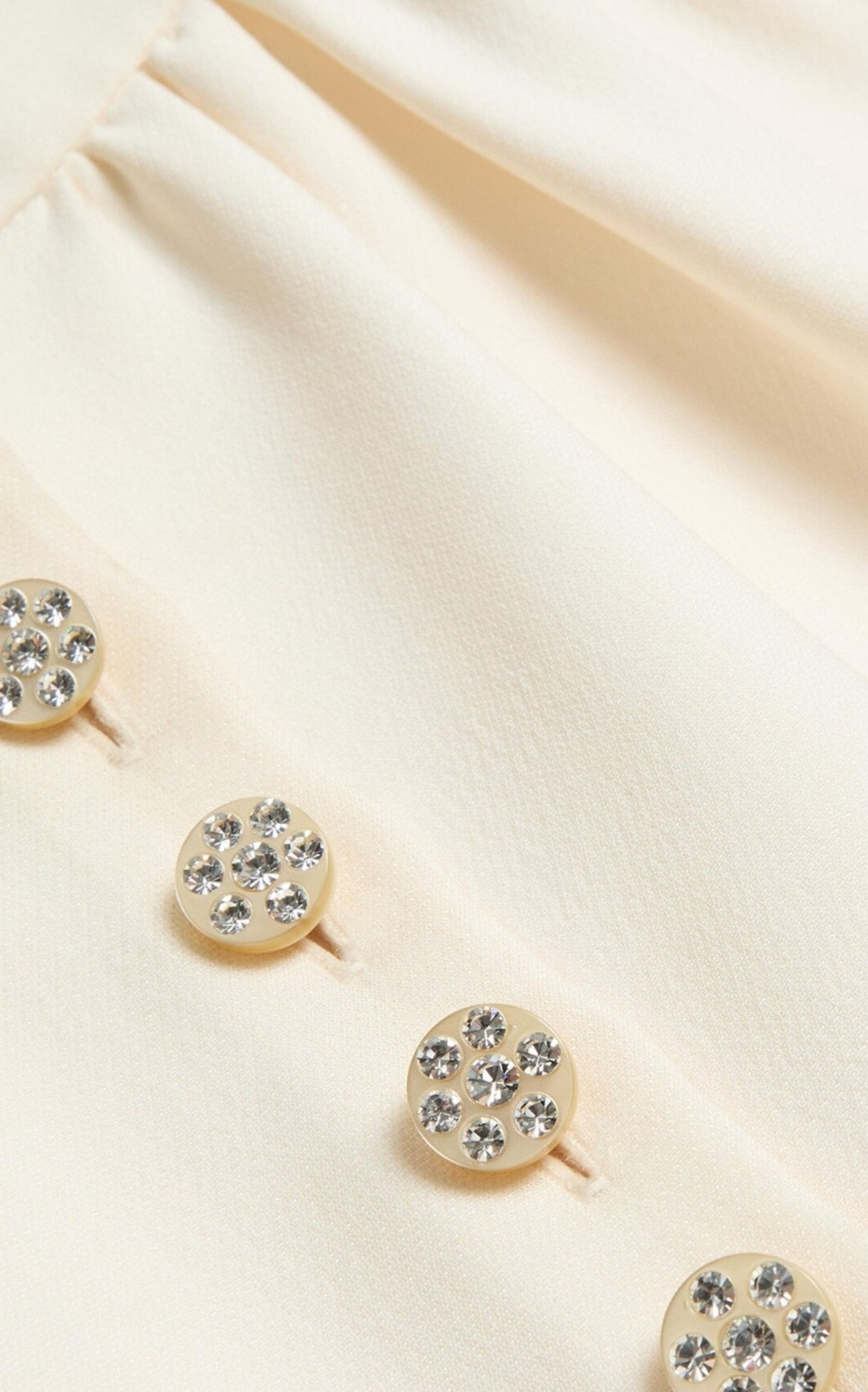 هذا تنورة فالنتينو كريب كوتور متوسطة الطول مصنوع من مزيج فاخر من الصوف البكر والحرير بلون عاجي أنيق. يتميز بتصميم عالي الخصر مزين بأزرار مرصعة بالكريستال وحافة مكشكشة ناعمة، بينما تضمن بطانته الحريرية ملاءمة ناعمة ومريحة. مثالي للمناسبات الراقية ولإطلالة أنيقة من الصباح إلى المساء.