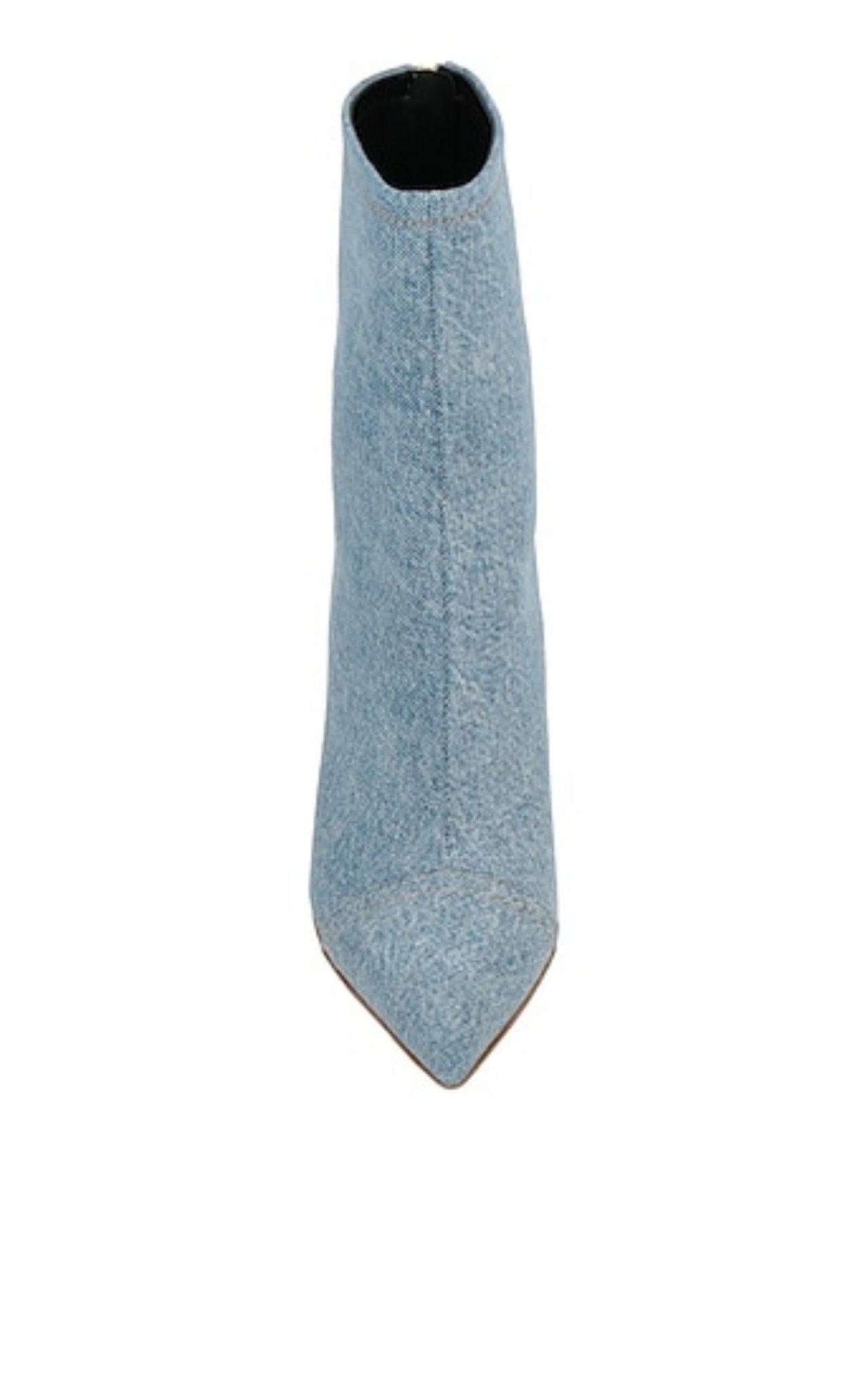 مصنوعة من قماش الدنيم الفاتح اللون، وتتميز بمقدمة حادة للغاية وكعب ستيليتو أنيق بلون ذهبي بارتفاع 95 ملم.