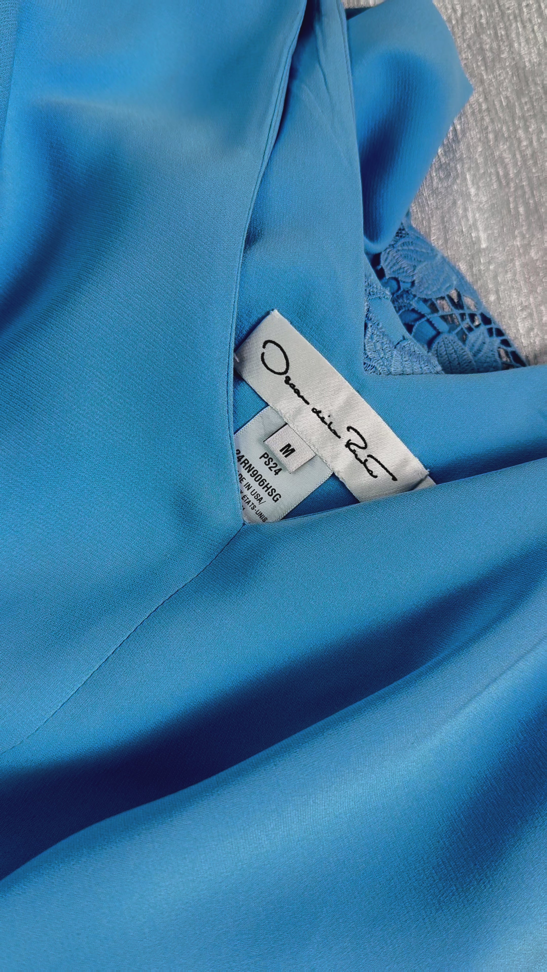 هذا الفستان القفطان من الحرير الجورجيت بنقشة الغاردينيا من تصميم أوسكار دي لا رينتا مصنوع من قماش جورجيت حريري مطاطي بلون أزرق فاتح، ويتميز هذا الفستان القفطان المذهل بقصة انسيابية مزينة بدانتيل غيبور بنقشة الغاردينيا على طول الألواح الجانبية المتتالية.