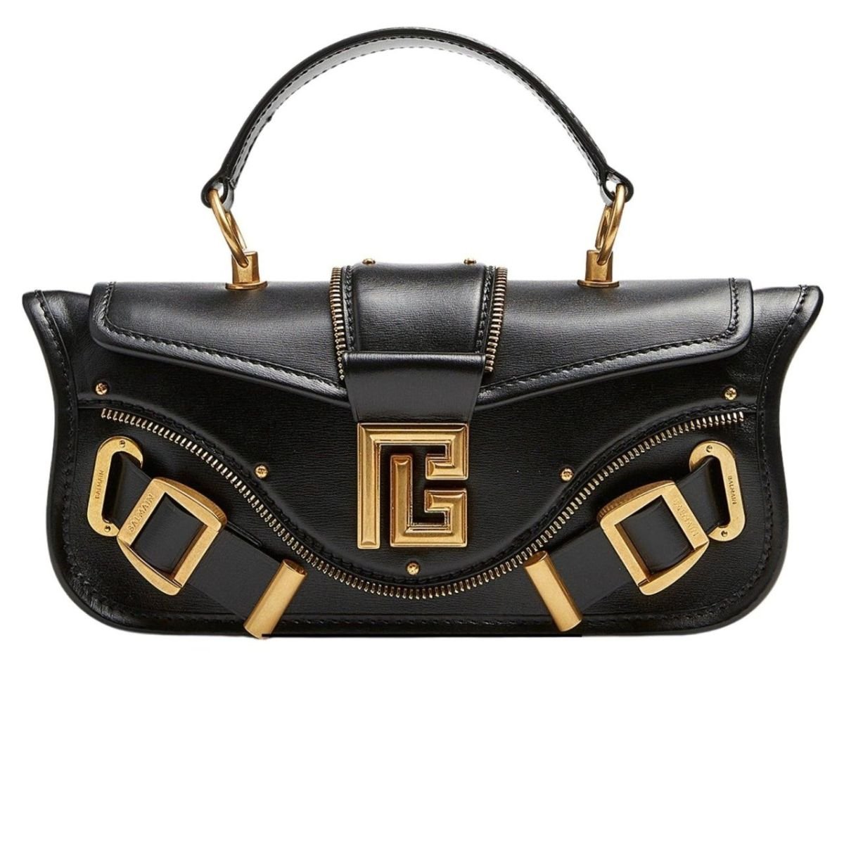 Con reminiscencias de la distintiva silueta de las icónicas chaquetas Balmain, este bolso de hermoso diseño destila la sofisticada estética militar de la marca parisina. Presenta espectaculares espirales y elaborados detalles dorados que contrastan con la lujosa y oscura piel auténtica.