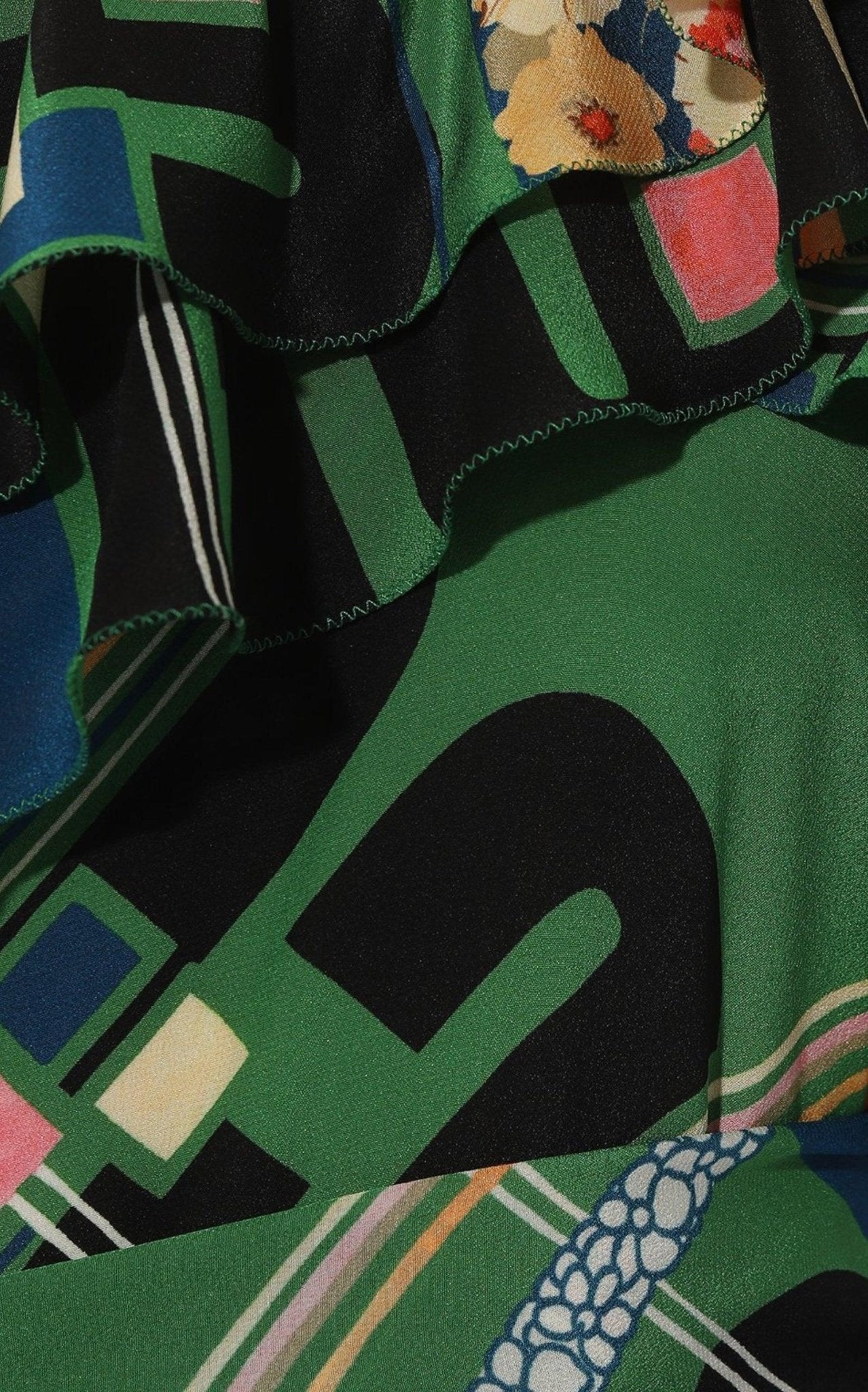تتميز هذه القطعة برسومات زهرية متناقضة، ونقوش مربعة، وشعار الدار المميز، وهي مصنوعة في إيطاليا بتصميم كلاسيكي بياقة هالتر، ومزينة بطبقات متتالية من الألواح المكشكشة لخلق حركة أنيقة.