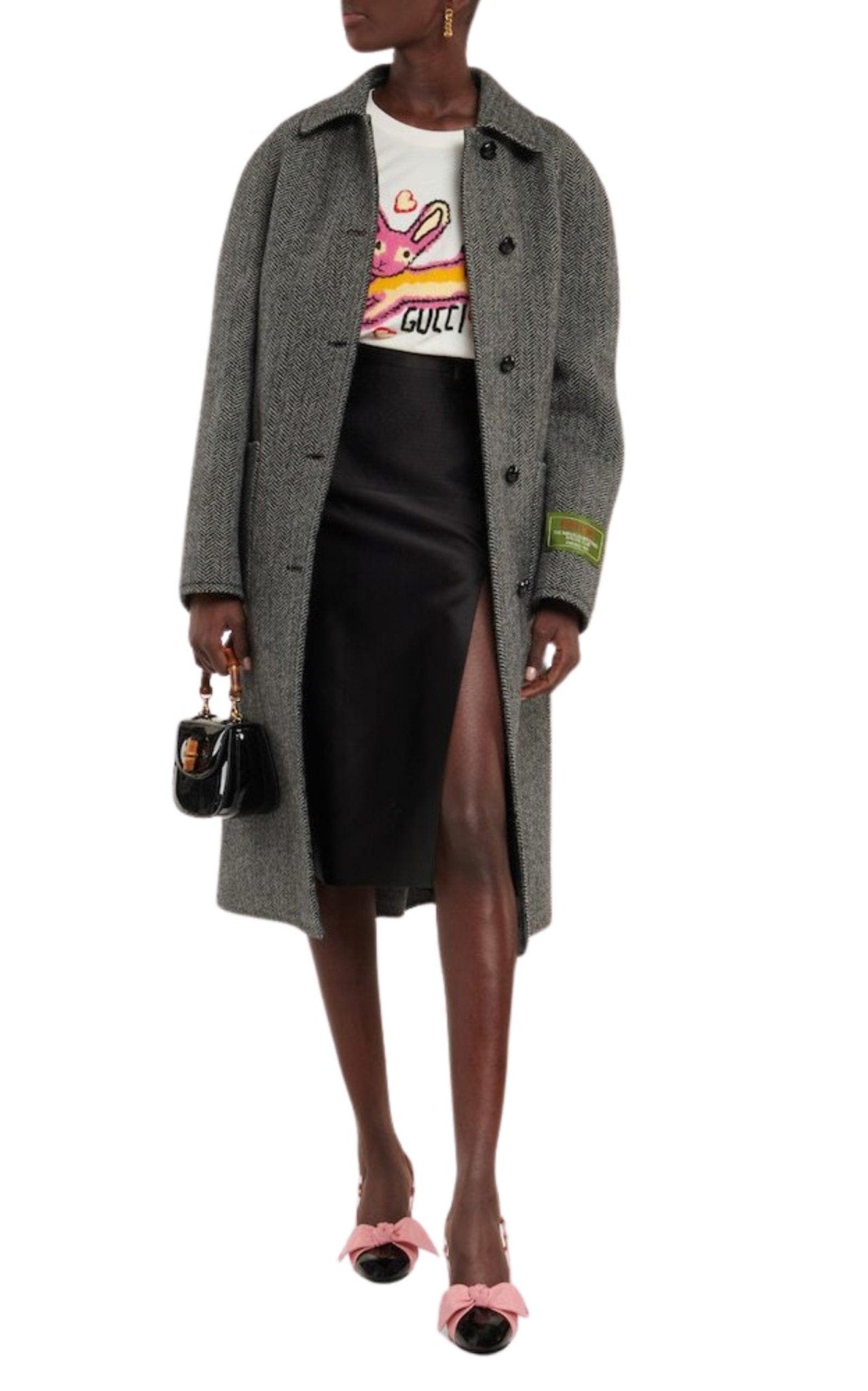 صُنعت هذه الأحذية ذات الكعب العالي المفتوحة من الخلف من الجلد المحبب، وتتميز بمقدمة من الجلد اللامع بلون متباين وأقواس على الجزء العلوي مزينة بلوحات حرف G المزدوج.