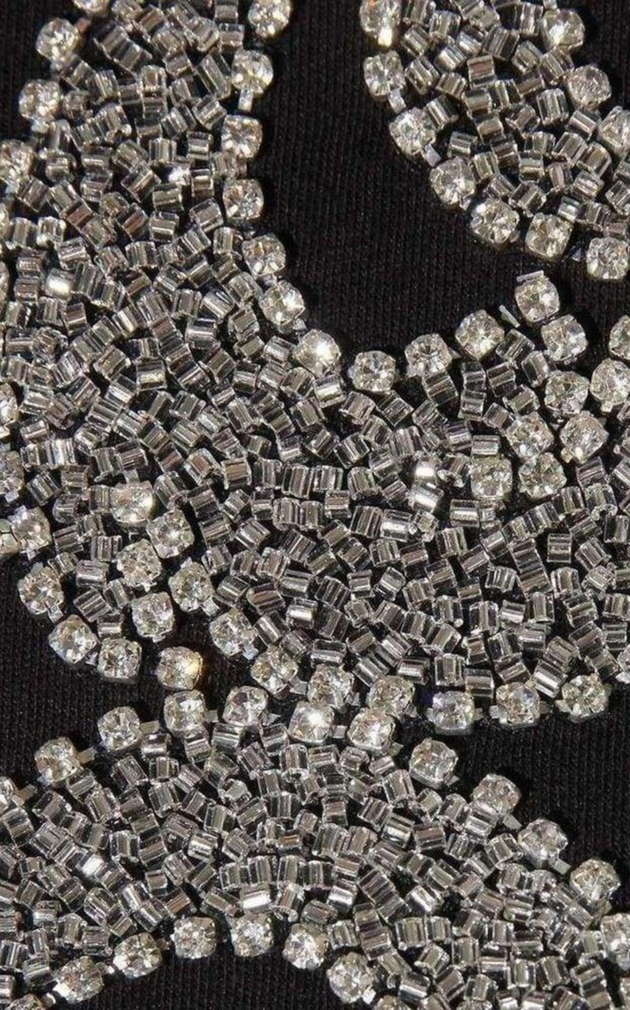 ياقة دائرية فضية، تطريز أمامي بالكريستال والخرز، شرائط أمامية من الكريستال والخرز المعدني.