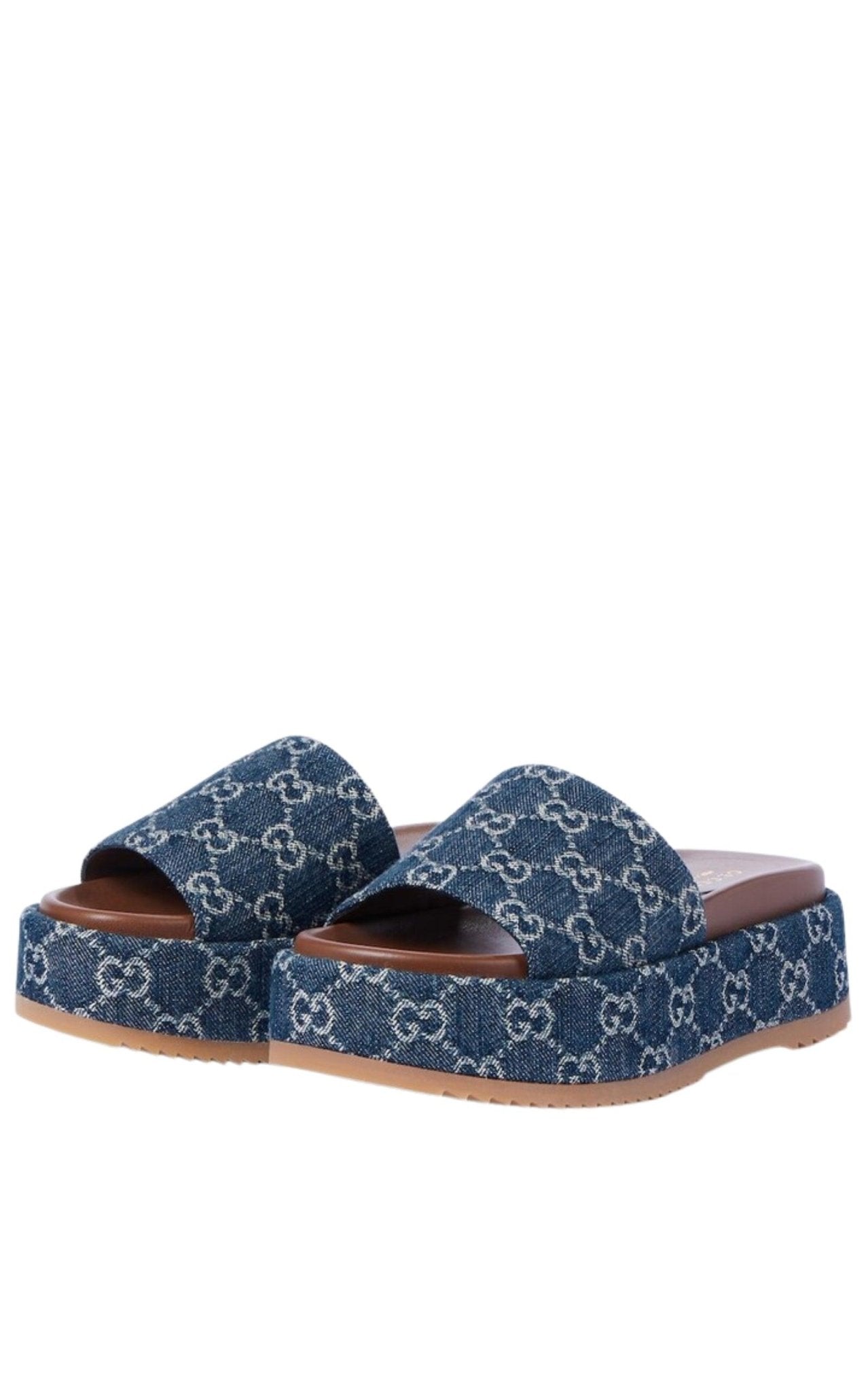 صُنعت هذه الصنادل الزرقاء من غوتشي أنجلينا 55 ذات النعل السميك في إيطاليا. تتميز بتصميم من القماش بنقشة GG Supreme المميزة، ونعل داخلي من الجلد البني، ونعل سميك بارتفاع 55 مم.