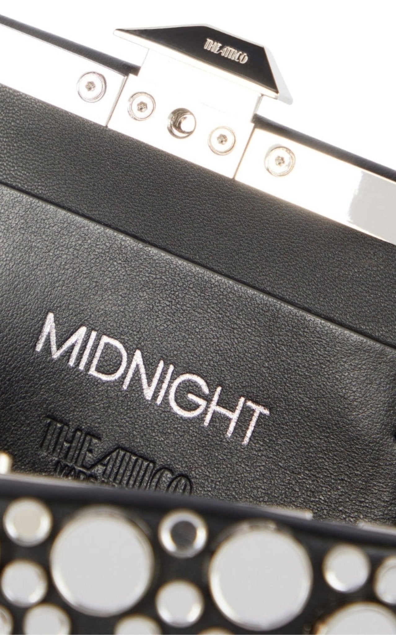 Mirror embellished leather with leather lining and silver-tone hardware.
