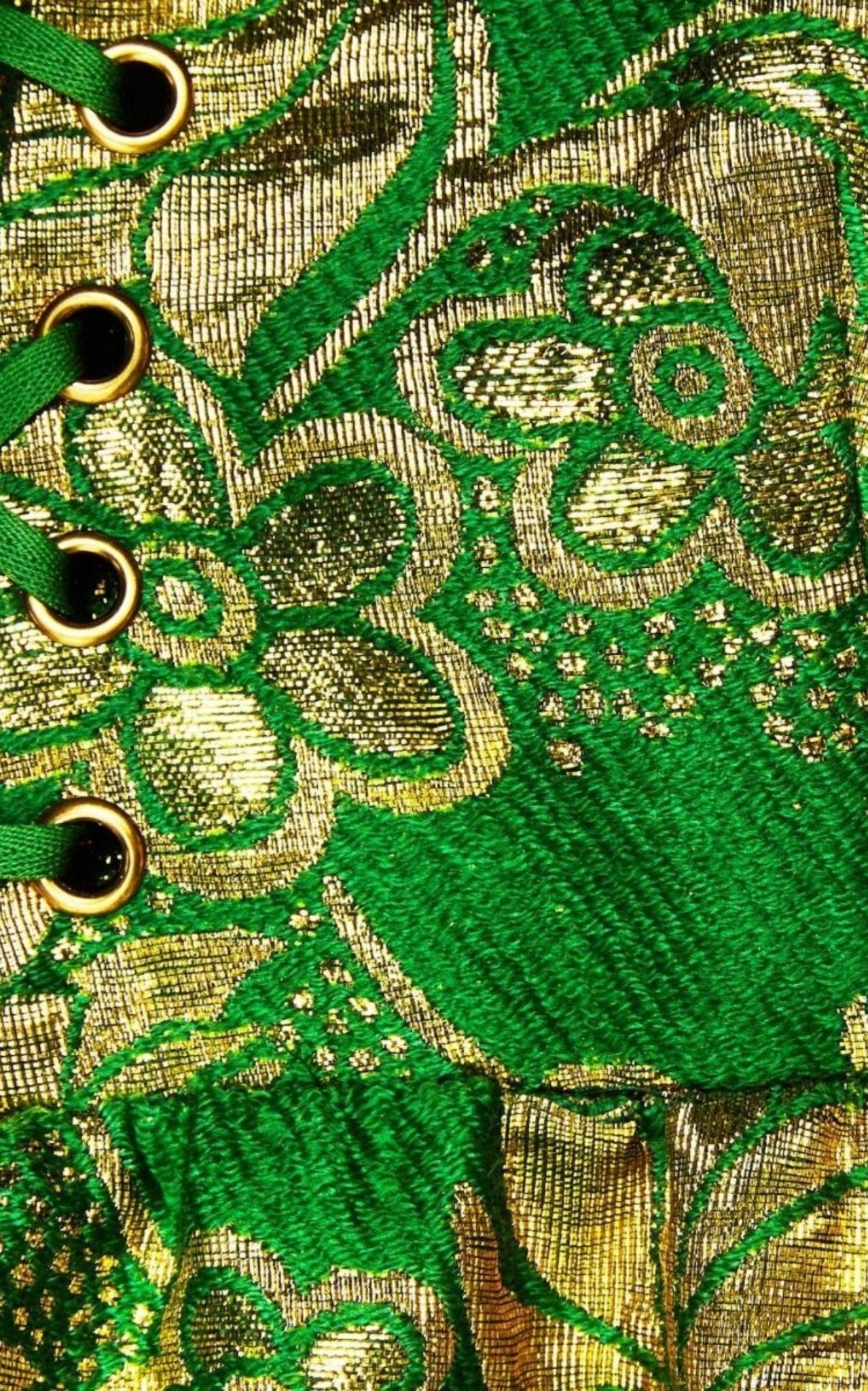 Green and gold floral patterned wool is punctuated by lamé detail on this front tie gown. Rich in pattern and decoration