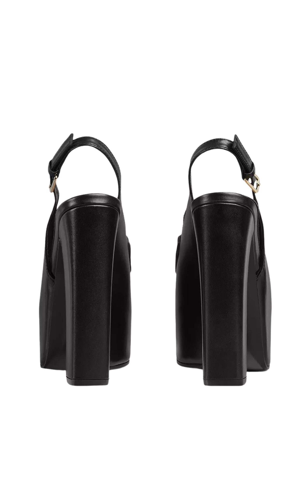 The elevated block heel and substantial platform create dramatic lift while maintaining stability and comfort. A buckled ankle strap secures the foot, and the tone-on-tone leather sole preserves the refined monochrome finish. Designed for statement dressing, the silhouette balances archival Gucci identity with contemporary proportions.