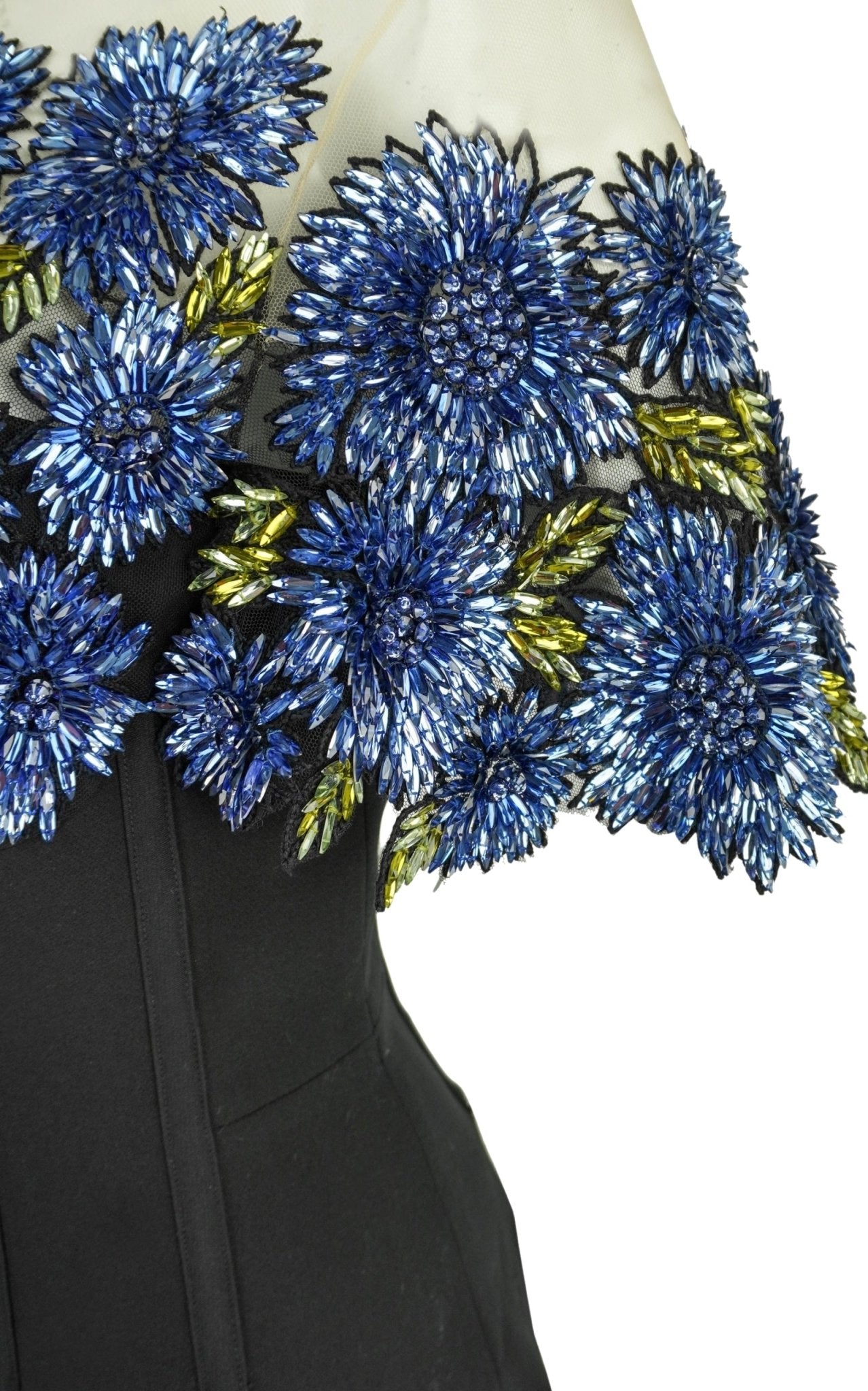 Embellishment: Dimensional floral embroidery with beaded detailing