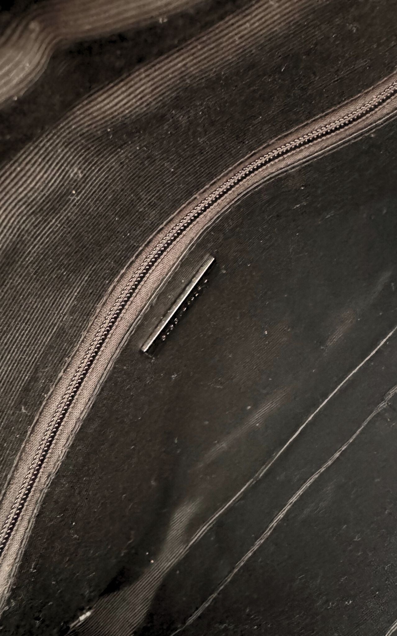 The flap construction is edged with fine chain trim that echoes the detachable chain shoulder strap, reinforcing the clutch’s sculptural geometry. Inside, the compact interior is fully lined and fitted with a zip pocket and logo label for secure organization. The result is a sleek occasion piece that combines classic quilting with modern metallic surface.