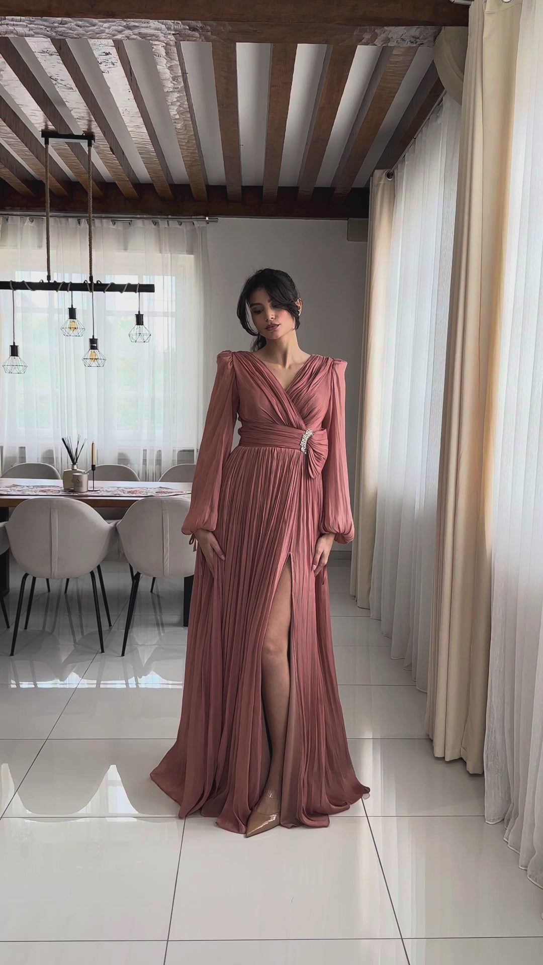 The V-neckline and softly structured shoulders balance the elongated long sleeves, while the pleated skirt falls into a full, sweeping length. Lightweight and fully lined, the gown maintains graceful flow and refined presence from formal events to black-tie occasions.
