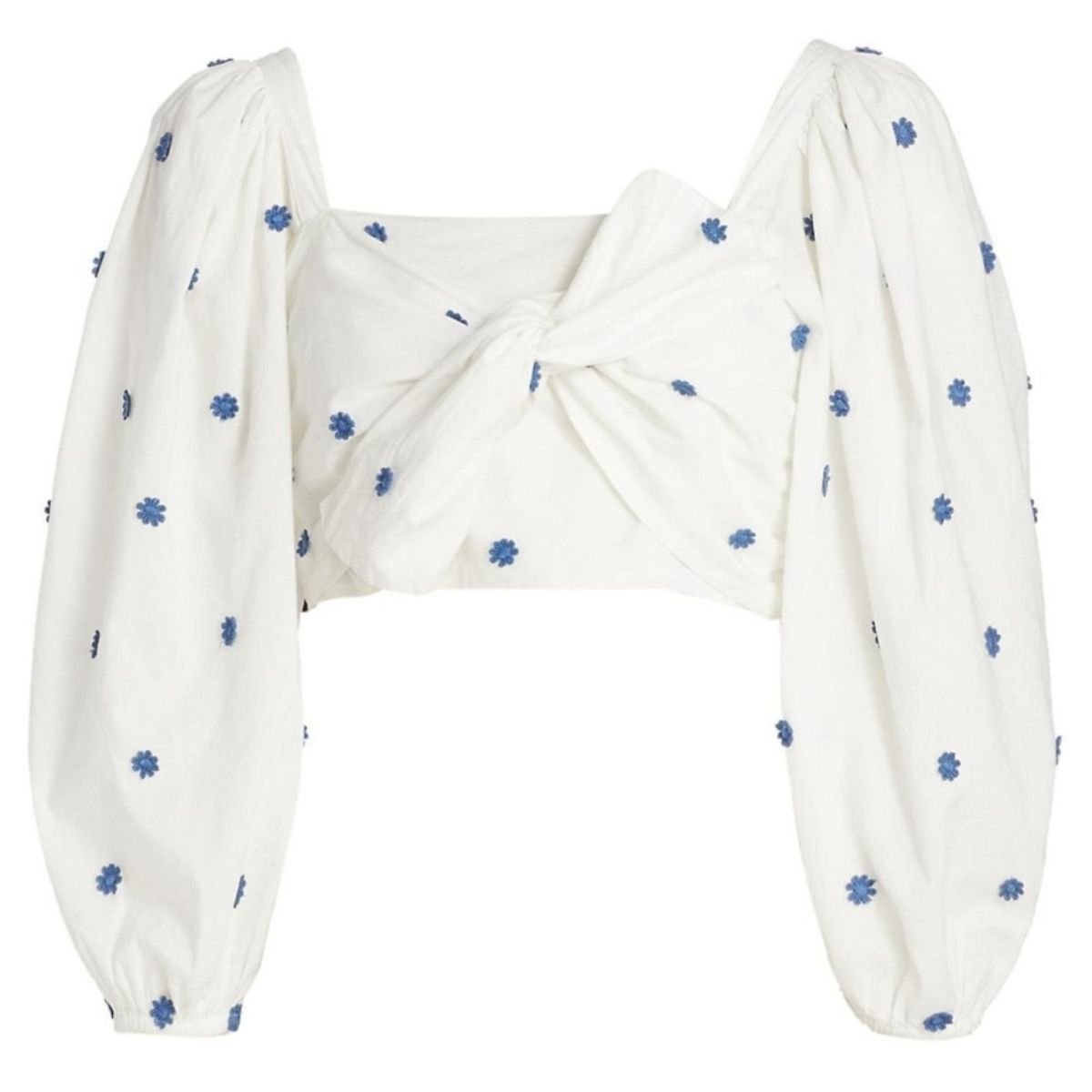 Bordado con pequeñas flores, el top corto de Farm Rio tiene un estilo con un nudo frontal asimétrico y mangas largas.