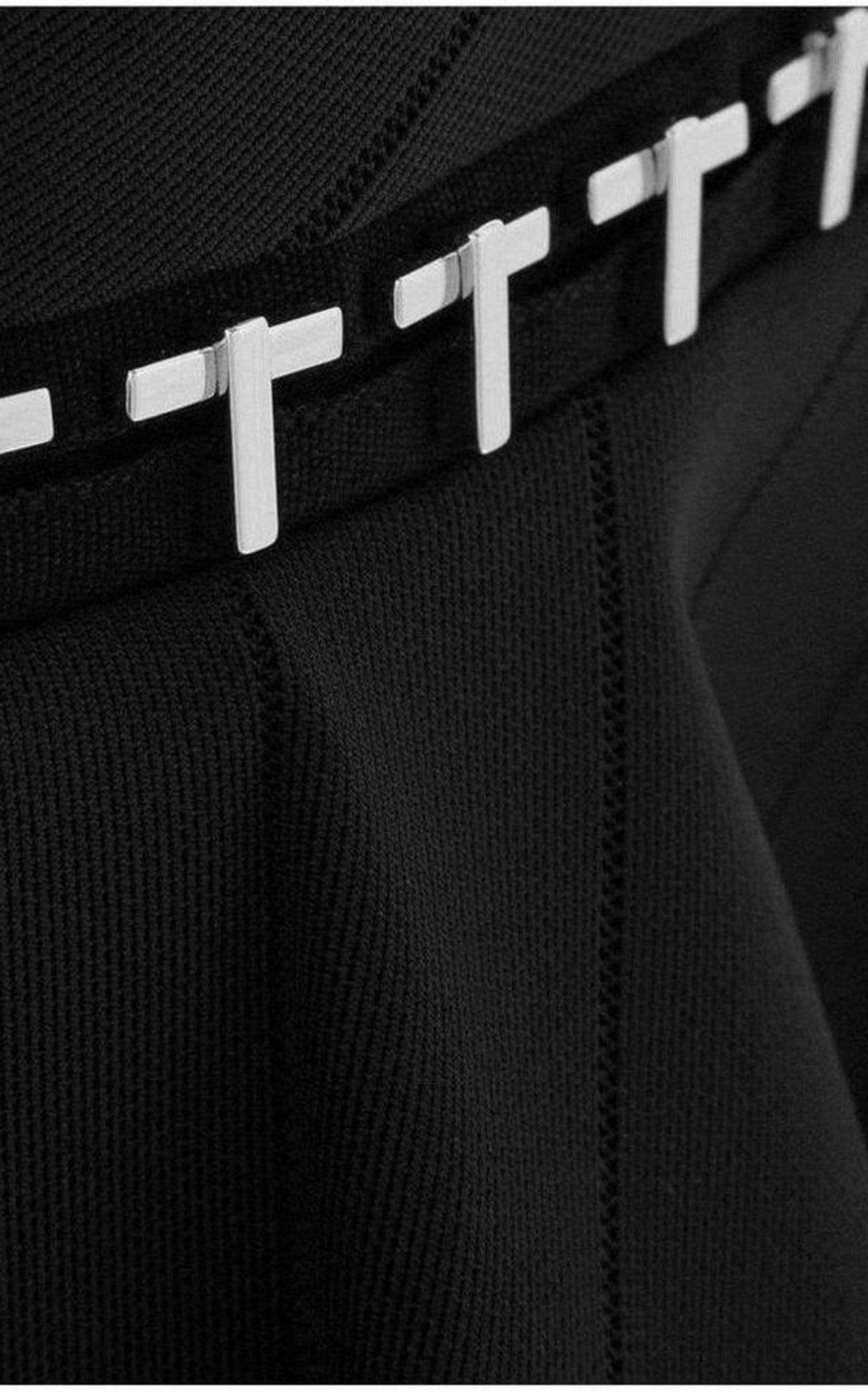 Das Versace Ausgestellter, verzierter Minirock wird aus einem hergestellt Strukturierter schwarzer Stretch-Polyamid-Mix Das Design formt die Taille und ermöglicht gleichzeitig fließende Bewegungsfreiheit im Saum. Taillenlange, knielange Silhouette liefert ein klares, architektonisches Profil.