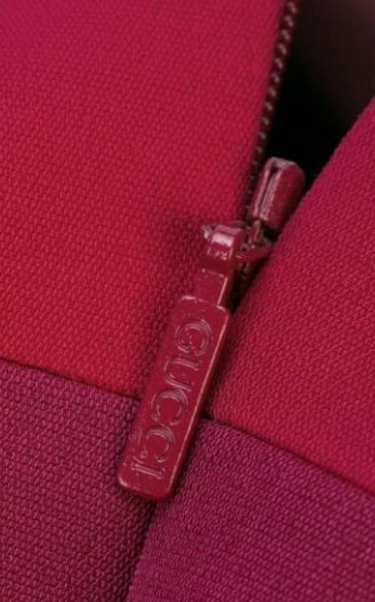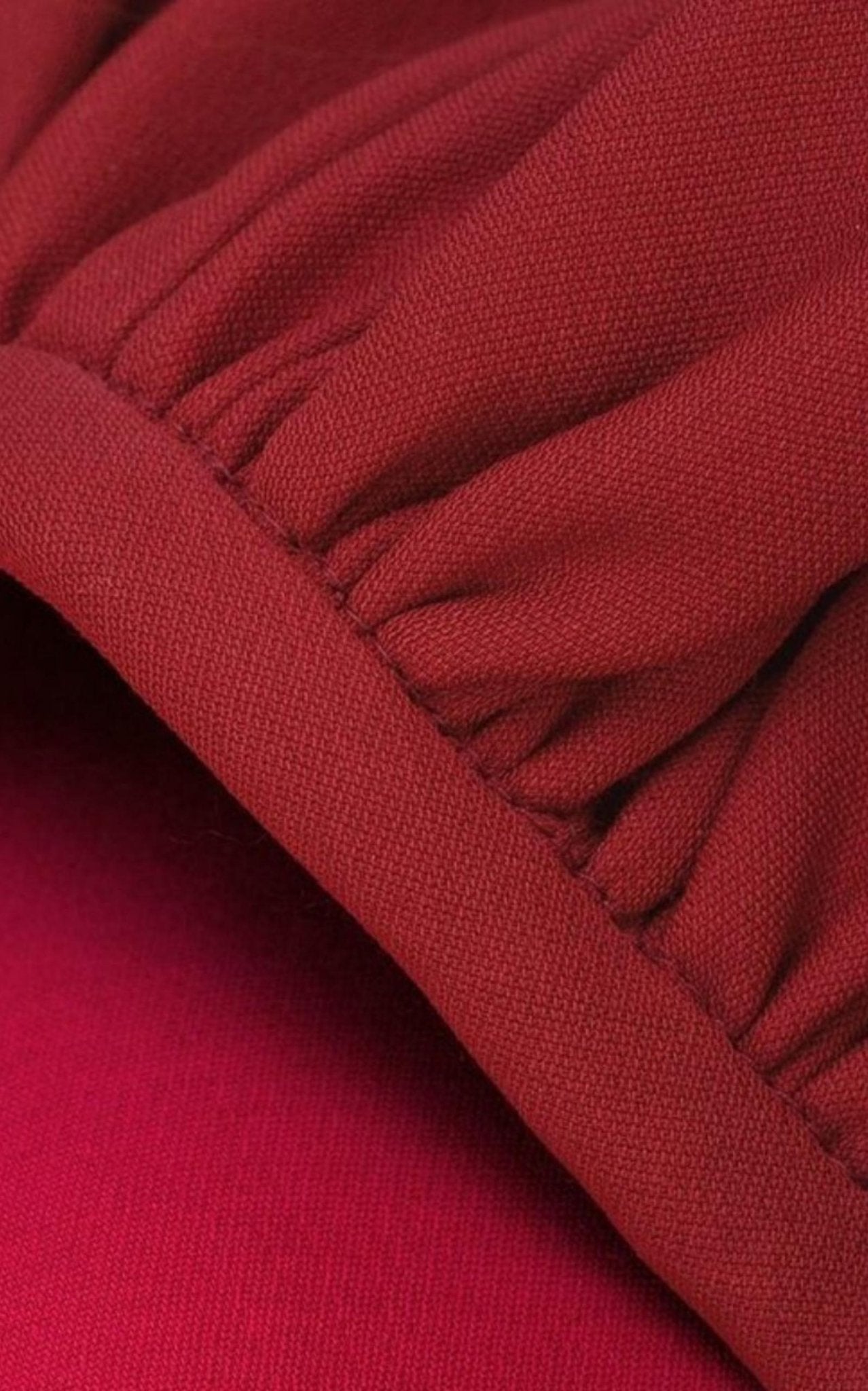 فستان كاب متعدد الطبقات مستوحى من الطراز القديم، بتصميم طبقات متناسقة الألوان. مصنوع في إيطاليا من مزيج من الصوف والحرير باللونين الأحمر والوردي.