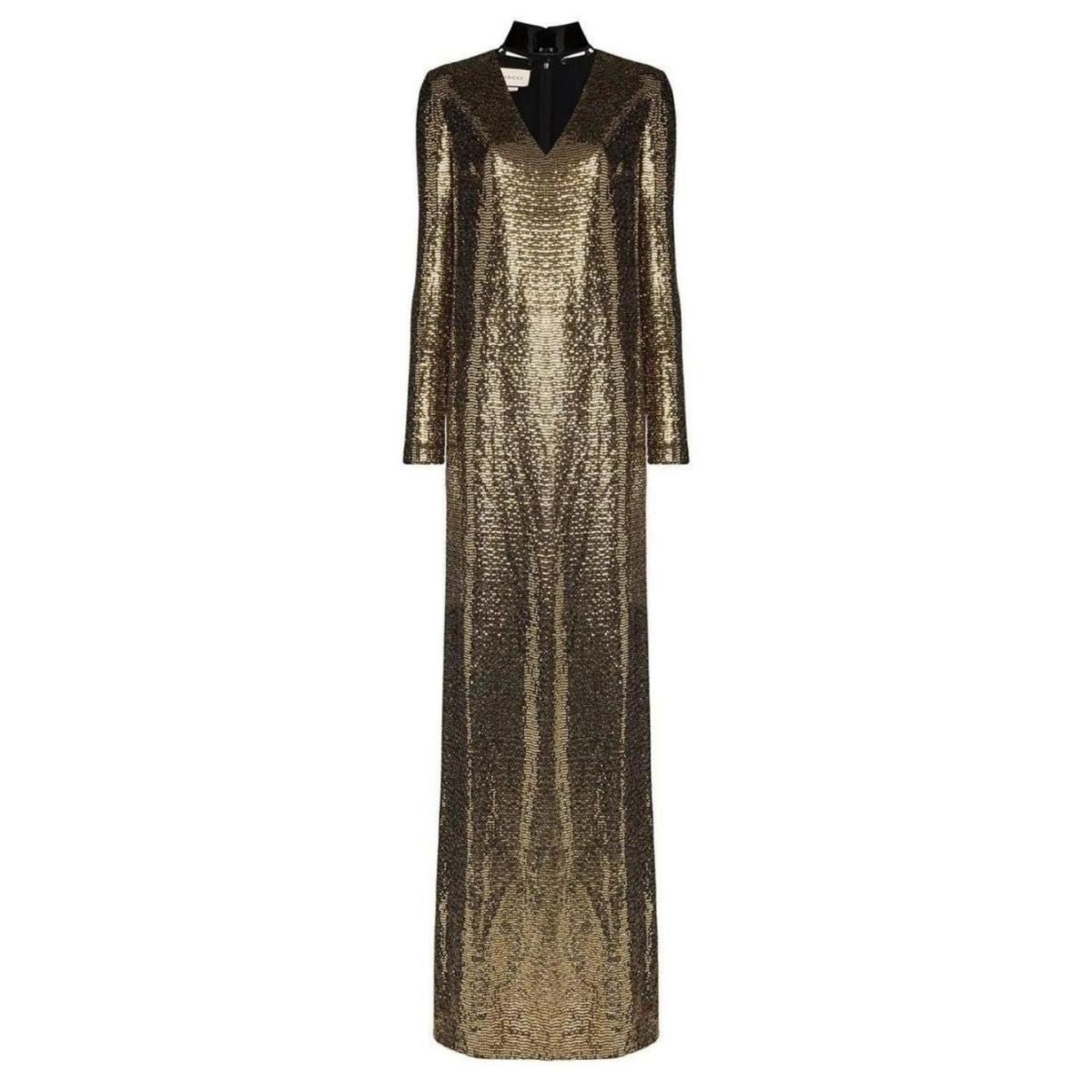 Este vestido de cota de malla con gargantilla de charol Gucci en tono dorado está confeccionado en Italia y presenta un forro de crepé.