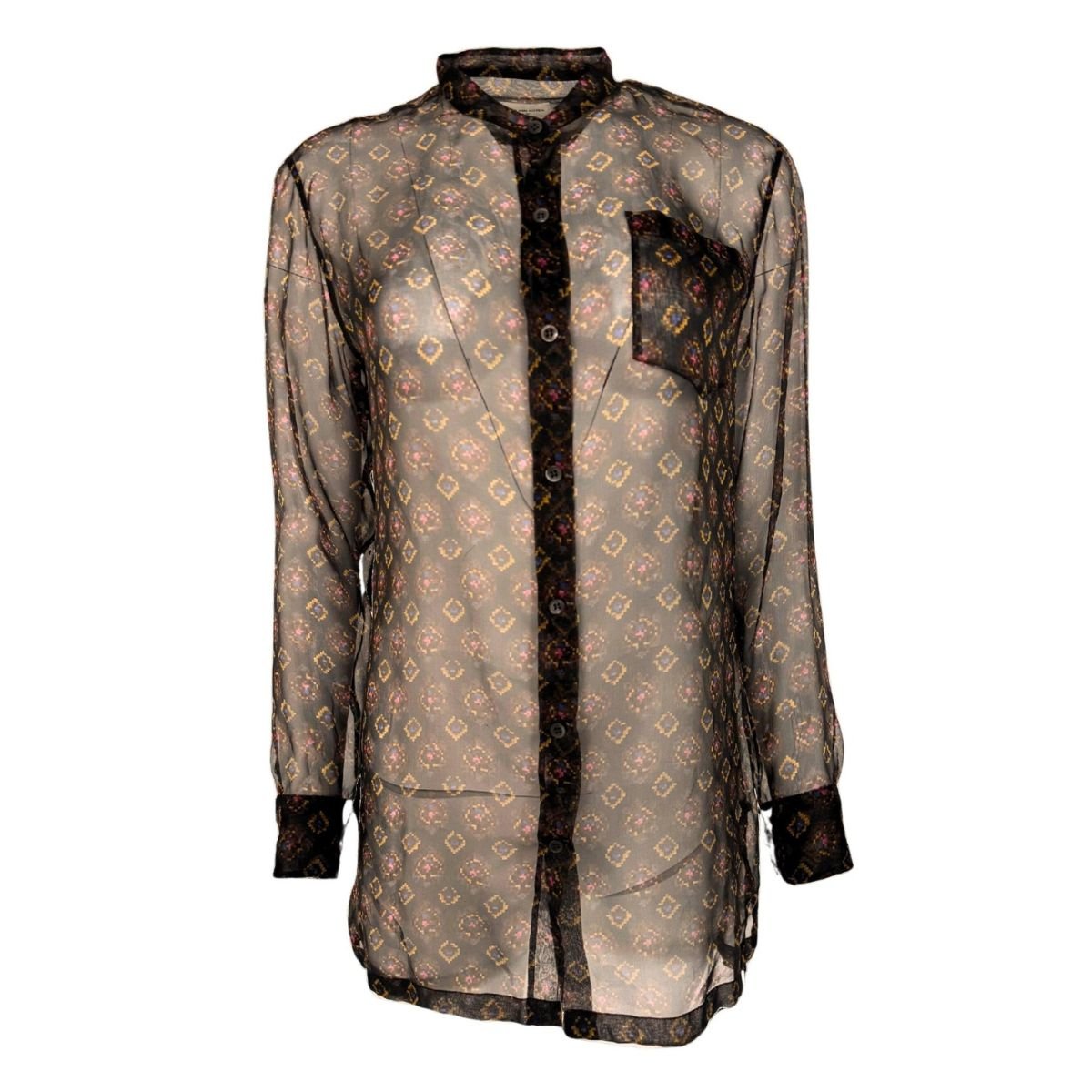 Blusa túnica de gasa de seda transparente con estampado de medallón pixelado.