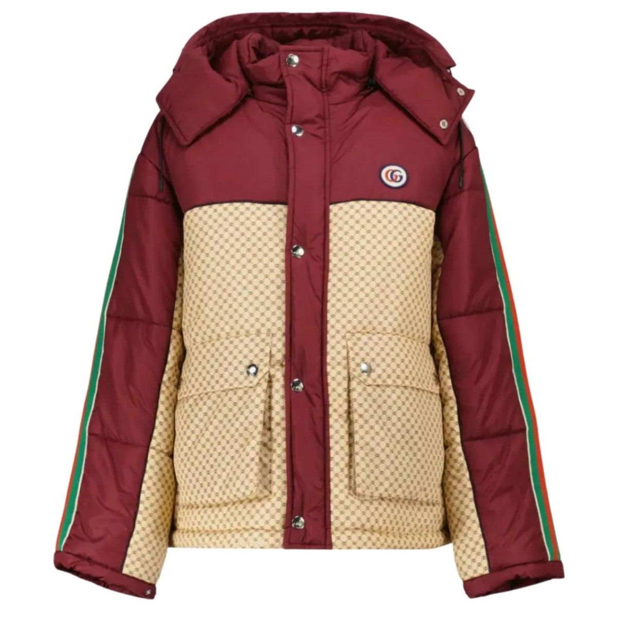 Esta chaqueta reversible, confeccionada en nailon brillante, tiene un relleno de plumas que proporciona mayor calidez para los meses más fríos y está enriquecida con un parche de G entrelazada, una referencia al logotipo característico de la casa.