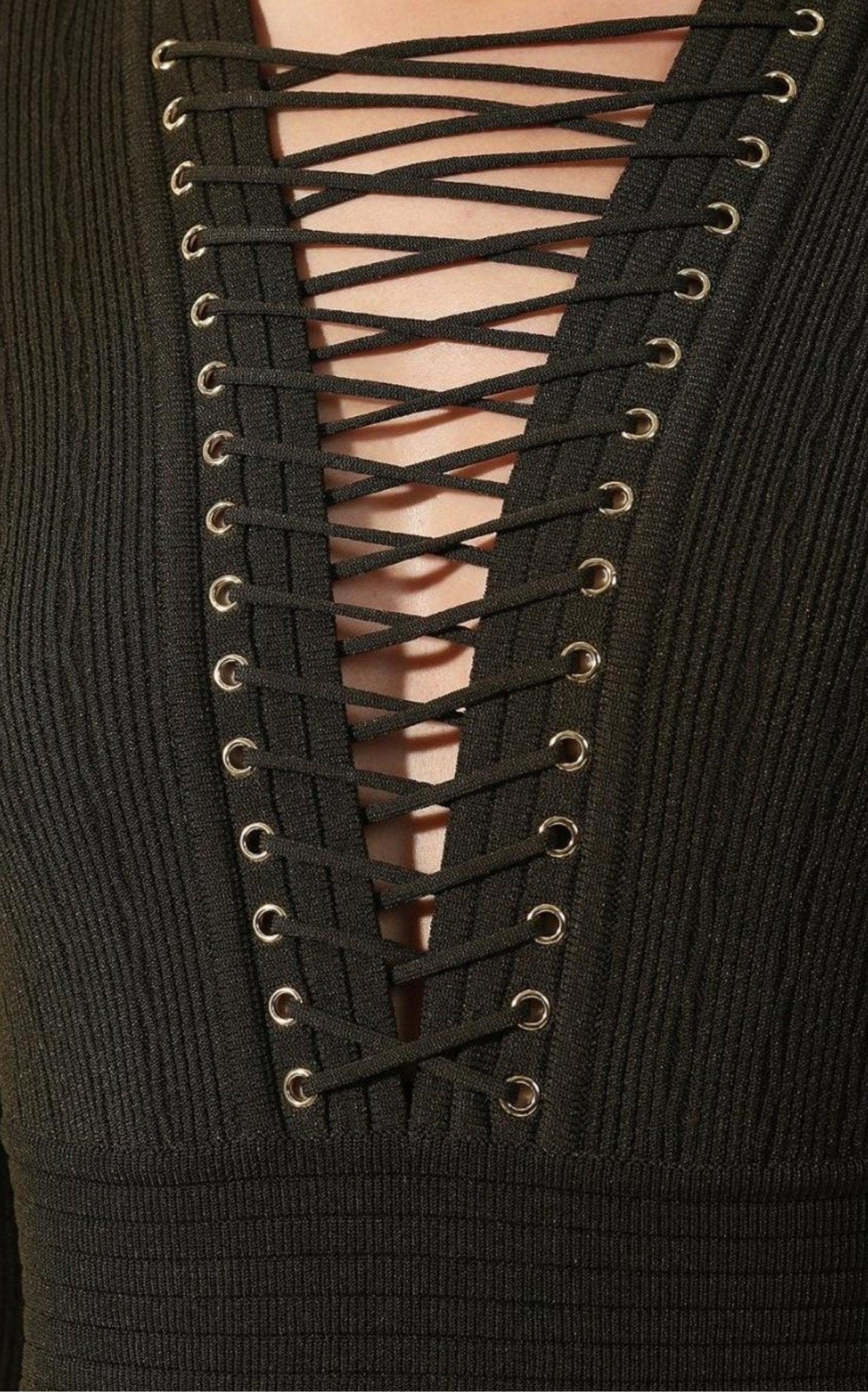 Ligeramente acolchado en los hombros, este vestido midi de canalé se ha tejido en Francia para un ajuste ceñido que se adaptará a la perfección a tus curvas. Combina cualquier joya con los ojales dorados del escote con cordones.