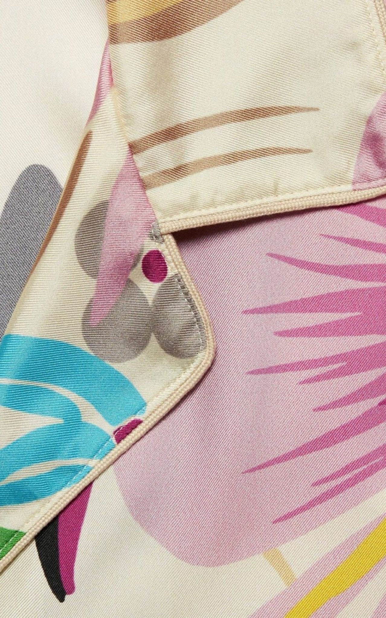 Gucci’s floral print silk shirt is crafted in Italy from luxurious 100% silk and designed in a cream base with a vibrant all-over floral motif. The oversized silhouette delivers fluid movement while maintaining a refined, structured profile.