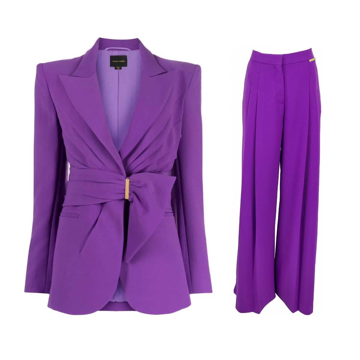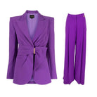 Zuhair Murad’s tailored set delivers couture-level refinement through sculpted proportions and fluid tailoring. Crafted in Italy, the blazer features precise gathering at the waist, a belted silhouette, and classic notched lapels that frame a sharp V-neckline. Gold-tone logo detailing adds a discreet signature finish, while front welt pockets and a straight hem maintain a clean, architectural line.