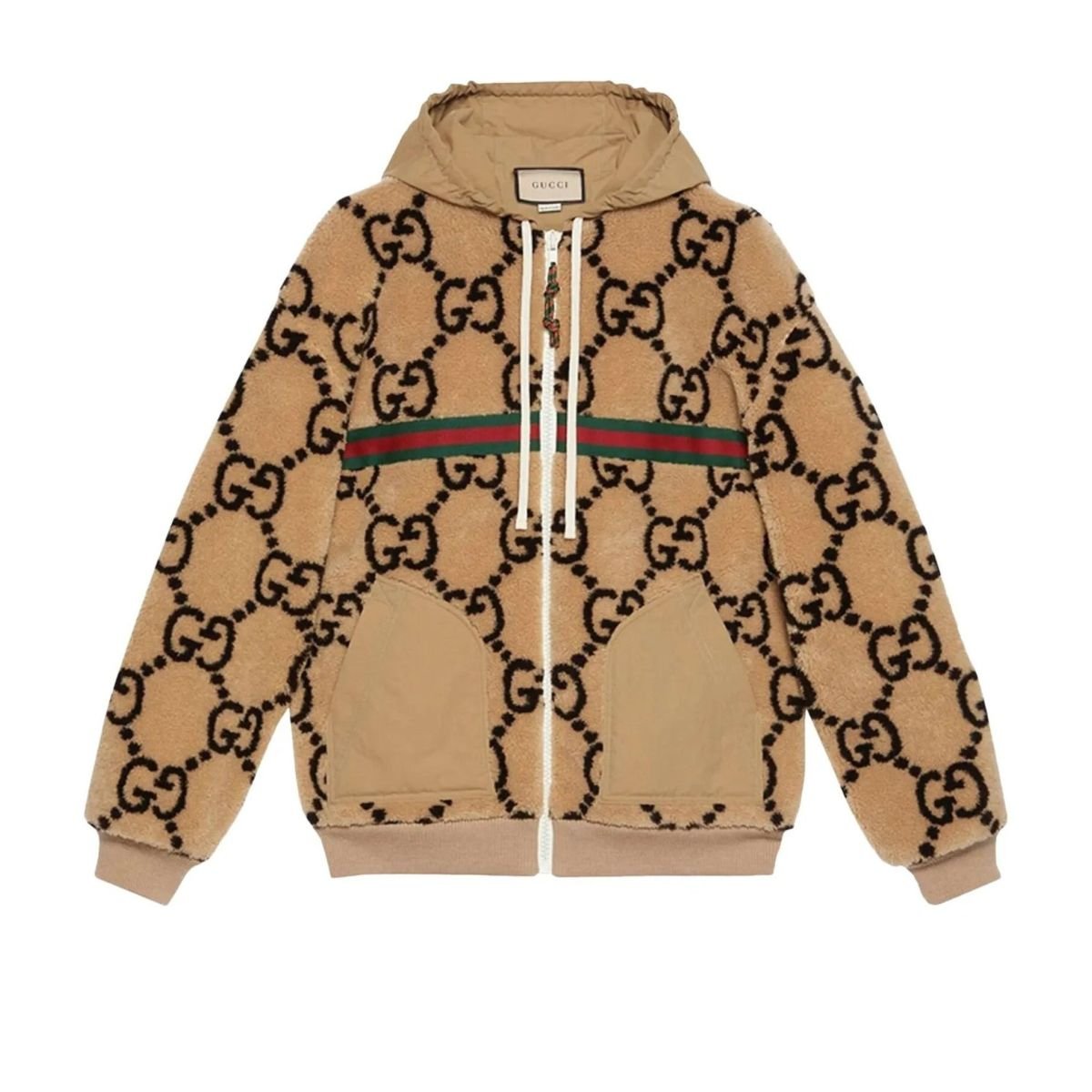 This Gucci fleece jacket is a standout outerwear piece that delivers cozy functionality with luxury aesthetics. Designed in a warm beige wool blend with a fleece finish, the oversized GG monogram adds bold texture, while the striped Web detail and slouchy hood complete the look with unmistakable Gucci flair.