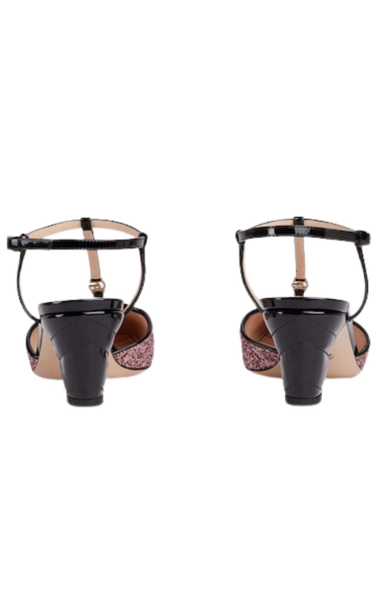 Subtle Gucci Pink Glitter Slingback Double G Pumps 55mm. Crafted in leather, the design features a square, closed toe, T-bar strap with GG hardware and a wrap-around ankle strap. They sit on a unique, padded Matelassé leather heel and are topped with shining pink glitter for a stand-out finish.