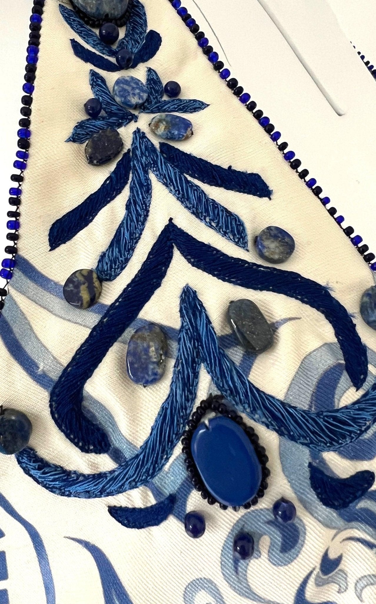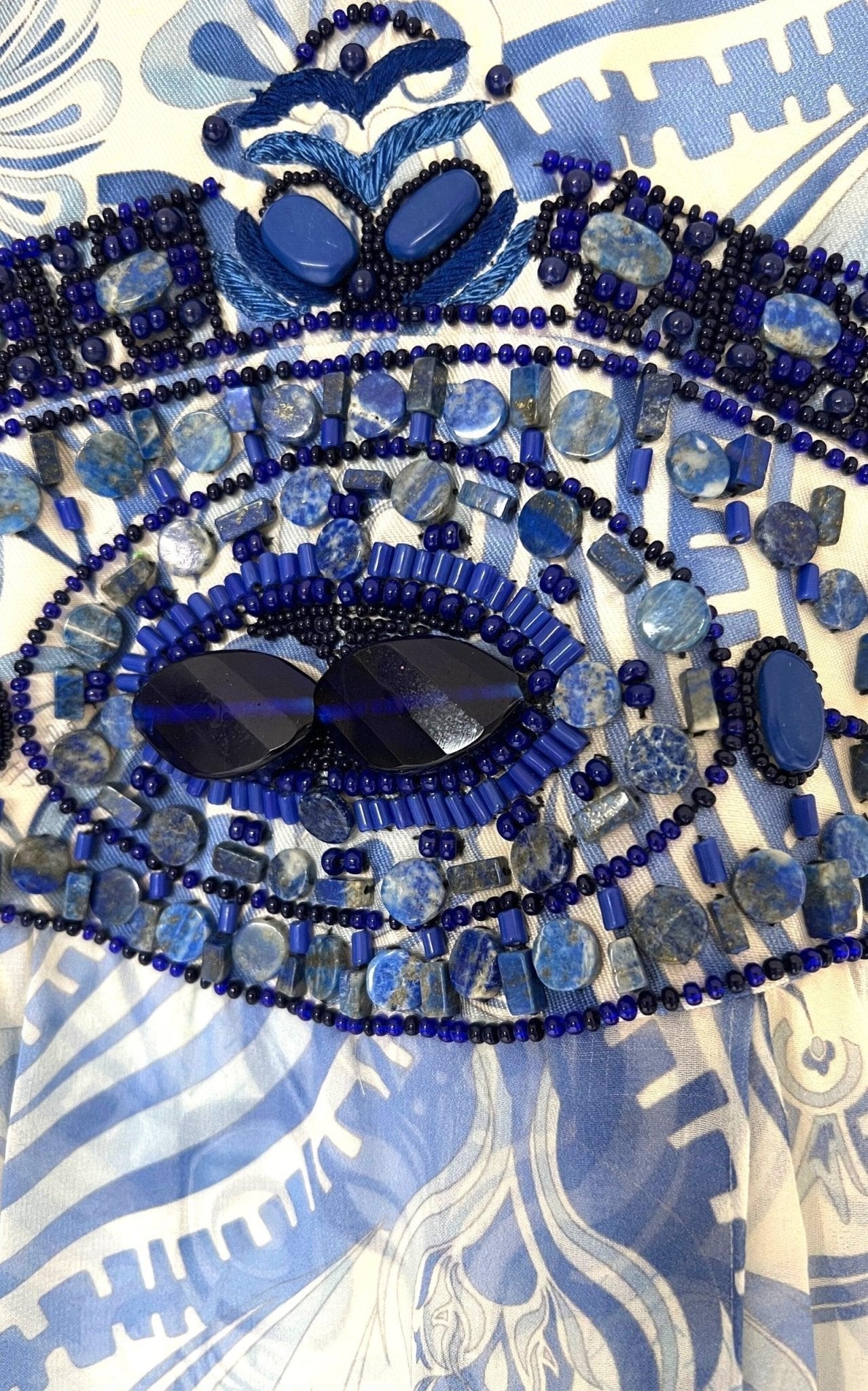 Emilio Pucci white and blue greek bleach pattern maxi halter dress with Lazurite stone embellishment