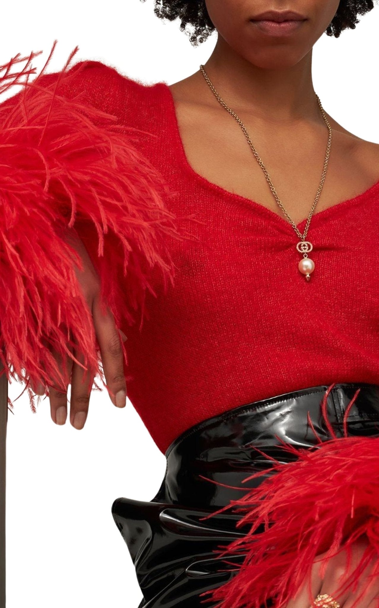 A crystal-embellished Interlocking G emblem anchors the design, complemented by a smooth glass pearl pendant and a subtle spiked stud detail. The combination of textures - polished metal, luminous pearl, and sparkling crystals - adds dimension while maintaining an elegant, wearable profile.